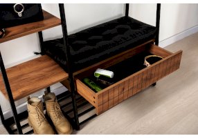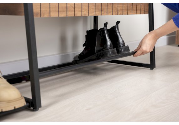 Сиденье с мягким элементом из кожзама, съёмная металлическая полка для обуви.