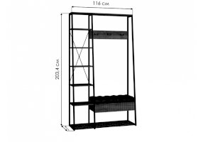 Металлические стойки, открытые полки, крючки. Один выдвижной ящик на направляющих скрытого монтажа с доводчиками.