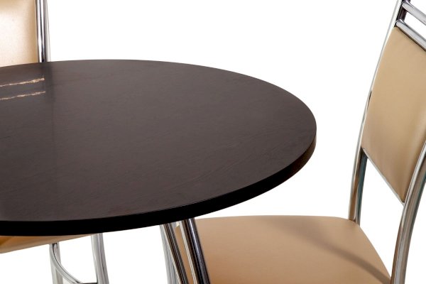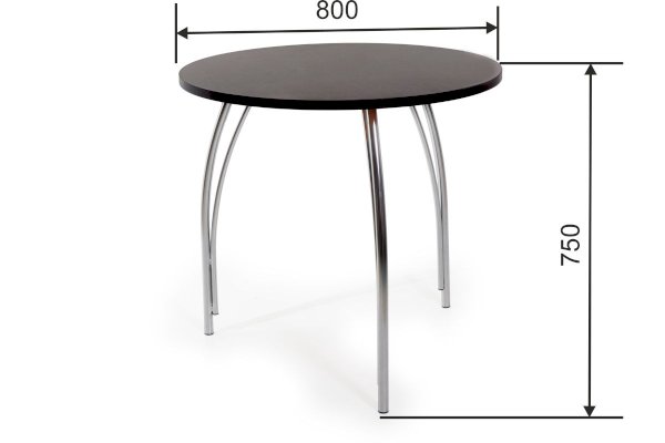Такой стол хорошо подойдёт для малогабаритной кухни или для дачного домика. Крепкие металлические ножки защищены от влаги слоем краски, ламинированная столешница легко моется, пластмассовые набойки на ножках препятствуют появлению царапин от ножек на полу.
