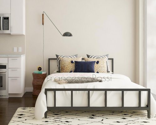 Благодаря отсутствию сплошного полотна изголовья и основания и его замены на горизонтальные перекладины модель выглядит изящно и совершенно не громоздко, благодаря чему может гармонично дополнить любой интерьер в современной стилистике.