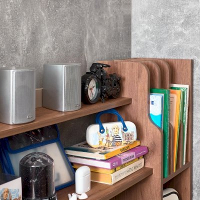 Два небольших ящичка, открытые полки и ниши стеллажа-надстройки к модулю Nature 84 Cтол письменный помогут организовать рабочее место так, чтобы все было под рукой. Надстройка с фигурными закругленными краями может собираться на правую и левую сторону из одного комплекта деталей.