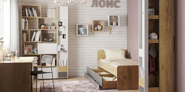 Нередко хобби ребенка перерастает в нечто большее и становится не только способом реализовать свои творческие способности, но и делом всей жизни. Уникальный выдвижной шкаф для хобби ЛОЙС 85 с двумя зонами хранения: внутренняя закрытая зона и фасадная часть с карманами. Внутри шкафа полки с ограничителями и ниша с крючками, где можно хранить форму для тренировок, мячи, ролики, наборы для творчества и другие аксессуары для хобби. Зона хранения на самом фасаде включает в себя: карман для высоких бумаг и ватманов, ручку, выполненную виде полочки, и два крючка, на которые удобно повесить заработанные медали, скакалки, элементы декора. Выдвижная система ЛОЙС 85 на роликах оснащена широкими шариковыми направляющими полного выдвижения. С ЛОЙС 85 в комнате появится место для хранения вещей тесно связанных с увлечениями детей. Модуль обязательно крепить к стене!