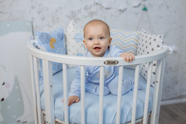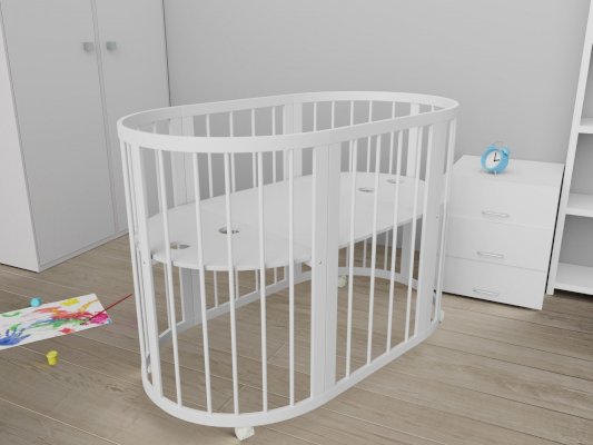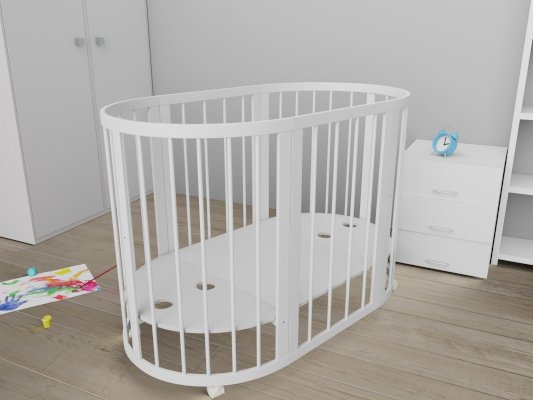 2. Овальная кроватка. Длину кроватки можно корректировать относительно роста ребенка. Это сделает покупку долговечной и избавит от необходимости покупать малышу новую кровать как минимум на пять лет вперед. Размеры овальной кроватки 78*128 см. Для овальной кроватки вы можете приобрести дополнительно овальный матрас
