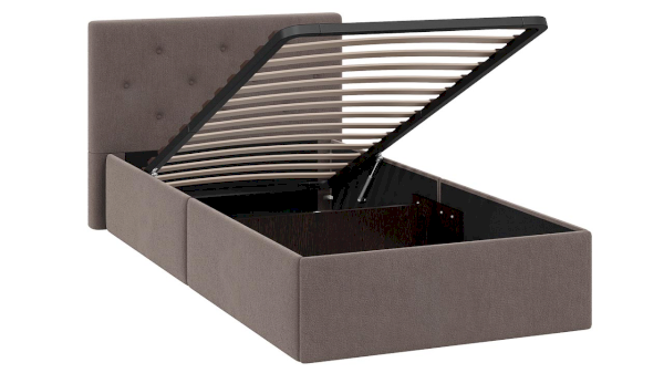 Кровать оборудована подъемным механизмом, обеспечивающим верхнюю фиксацию и удобный доступ к месту для хранения, а усиленная царга и дополнительное металлическое соединение повышают прочность конструкции.
