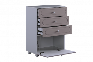 Комод оснащён тремя выкатными ящиками на шариковых направляющих, обеспечивающими плавный и надёжный ход. Ящики подойдут для хранения одежды, белья, аксессуаров или игрушек. В нижней части расположена вместительная откидная секция, предназначенная для более габаритных предметов и сезонных вещей.