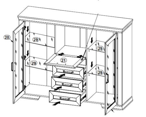 отделение в центральной части за откидной дверью, 3 выдвижных ящика на металлических роликовых направляющих
