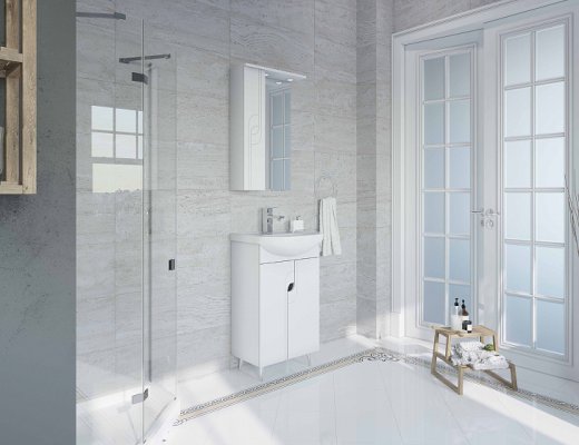 Зеркало в комплекте оснащено шкафчиком с мягкой подсветкой и влагостойким покрытием всей поверхности стекла для защиты от запотевания. Для хранения вещей предусмотрены вместительные полки в тумбе, которые можно варьировать по высоте.
